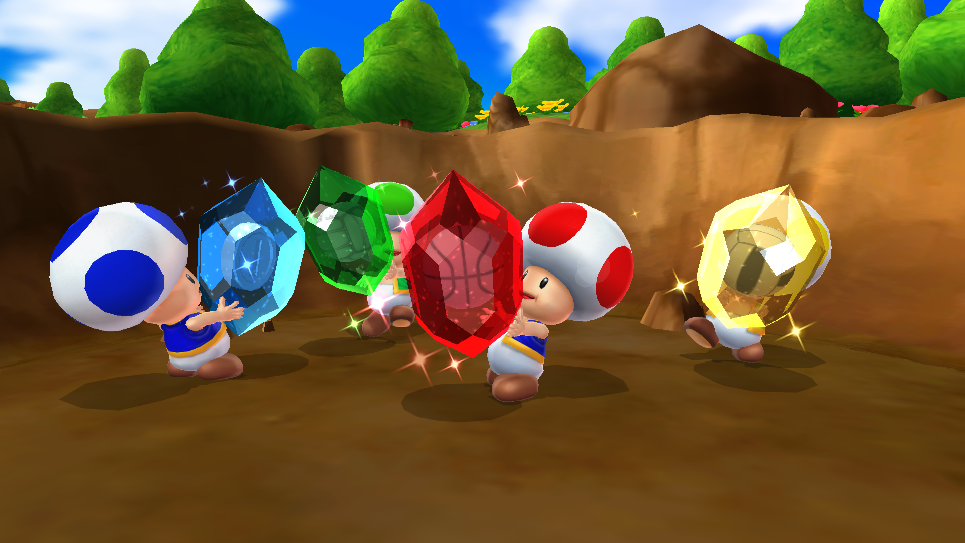 Capture d'écran des Toad découvrant des cristaux au point de l'impact du météore dans la cinématique d'introduction de Mario Sports Mix.