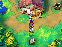 Capture d'écran de l'extérieur de la maison du quatrième sous-sol du donjon d'Azimut dans la version Nintendo DS de Dragon Quest IV : L'épopée des Élus (2007).